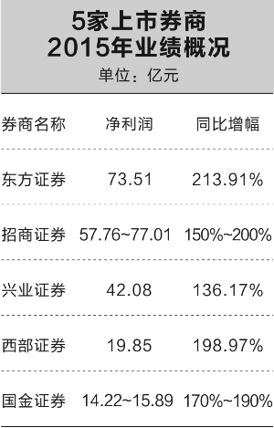 昨日晚間,東方證券、招商證券、國金證券分別發布2015年業績預增公告,另有興業證券、西部證券分別發布2015年業績快報。這5家上市券商凈利潤均實現同比至少翻番,其中東方證券以213.91%的增幅位居第一。
