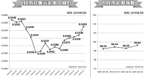 據測算,2016年2月29日,CFETS人民幣匯率指數為99.63,較1月末微貶0.52%;參考BIS貨幣籃子和SDR貨幣籃子的人民幣匯率指數分別為101.06和98.23,分別較1月末微貶0.35%和微升0.14%。總體來看,3個指數較1月末變動不大。