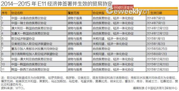 2016 年,除了已經簽署並生效的自由貿易協定外,還有一些協定已經簽署有待生效。例如,2015年土耳其與新加坡、韓國與越南簽署了雙邊自由貿易協定。此外,E11各經濟體還在積極推動新的自由貿易協定談判,並對一些可能建立的自貿區展開研究。以中國為例,目前正在談判的自貿區包括中國—海合會自貿區、中國—挪威自貿區、中日韓自貿區、區域全面經濟合作夥伴關係協定(RCEP)、中國—斯里蘭卡自貿區、中國—巴基斯坦自貿區協定第二階段談判、中國—馬爾代夫自貿區以及中國—格魯吉亞自貿區等,正在研究的自貿區包括中國—印度自貿區、中國—哥倫比亞自貿區、中國—摩爾多瓦自貿區以及中國—斐濟自貿區等。