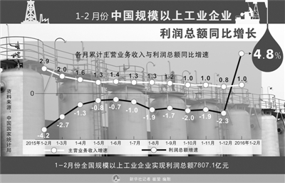 國家統計局3月27日公布,今年1—2月份,全國規模以上工業企業實現利潤總額7807.1億元,新增利潤355.4億元,同比增長4.8%,改變了2015年全年利潤下降的局面。