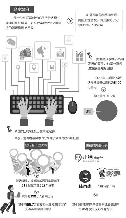 在交通出行領域,根據滴滴順風車曬出的春運成績單,春運期間,滴滴跨城順風車覆蓋了31個省區市的332個城市,累計有190萬人合乘出行,其中有55.7萬直接乘坐順風車回到了交通不便的偏遠村鎮,分享經濟化解社會問題的強大適應性得以體現。在住宿領域,包括“螞蟻短租”“住百家”“小豬短租”“朋友家”等創新企業百花齊放,螞蟻短租方面表示,其房源量與訂單量都在2015年實現500%的增長。