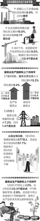 “5月份國民經濟運行總體平穩,穩中有進。”盛來運說,國民經濟運行的“穩”,首先表現在工業生產穩定。5月份,規模以上工業增加值同比實際增長6%,與4月份持平。從服務業看,5月份,服務業生產指數和上個月持平。從就業情況看,根據人社部數據,1至5月份,城鎮新增就業577萬人,完成全年計劃目標的57.7%。
