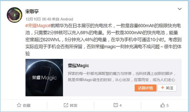 現在,有網友在網上爆料稱,榮耀這款未來手機所配的快充電池,能量密度超過620Wh/L,能夠5分鐘充入48%的電量,但考慮到實際應用于手機會否有所保留,否則榮耀Magic僅需十五分鐘充滿電將不成問題。