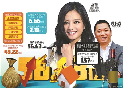 萬家文化表示,龍薇傳媒實際控制人趙薇夫婦投資金寶寶控股、順龍控股、阿里影業、雲鋒金融、唐德影視等多家上市公司股權,截至2016年底上述股票市值約45.22億元;另經初步統計,趙薇夫婦還持有不動產價值約6.66億元,其他股權投資價值約3.18億元;趙薇夫婦同時經營影視、酒業貿易、4S店等多項業務,截至2016年11月30日總資產合計約1.57億元。上述相關資產總價值約56.63億元,2016年投資收回的現金流約12.56億元港元。