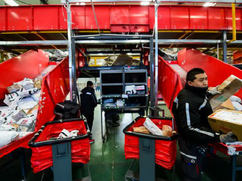 資料圖片:快遞工作人員正忙著分揀快件。新華社發