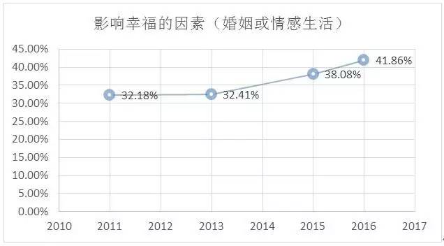 從整體趨勢來看,“收入水平”、“社會保障”對幸福感的影響已經不再像十年前那麼顯著,而婚姻情感的影響卻在上升。正所謂家和萬事興,一份和諧的家庭關係、一份真誠的情感,對人們的幸福是有多麼重要。