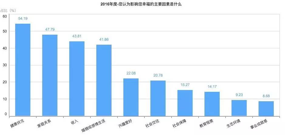 大調查發現,“健康狀況”已經在百姓心中成為影響幸福感的首要因素(54.19%),其他因素是:家庭關係(47.79%)、收入(43.81%)、婚姻或感情生活(41.86%)。