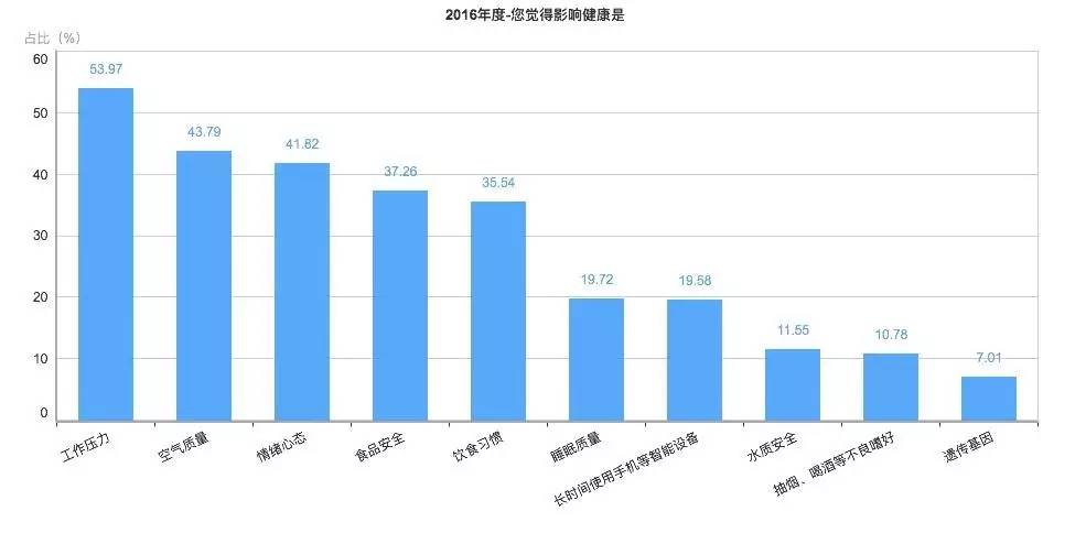 大調查細化對比發現,影響健康的主要因素依次是工作壓力(53.97%)、空氣質量(43.79%)、情緒心態(41.82%)、食品安全(37.26%)、飲食習慣(35.54%),選擇這五項的受訪者均超過三分之一。