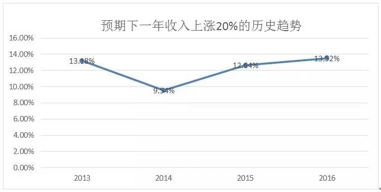 大調查數據顯示,超過55%的受訪者預期2017年收入會提高,與過去10年的數據對比,處于中高位置。值得注意的是,從2014年起收入高增長預期的受訪者比例連續遞增,預期2017年家庭收入增長將超過20%的受訪者比例為13.52%,達到近五年來最高點,預期收入將持平的受訪者比例也在上升。