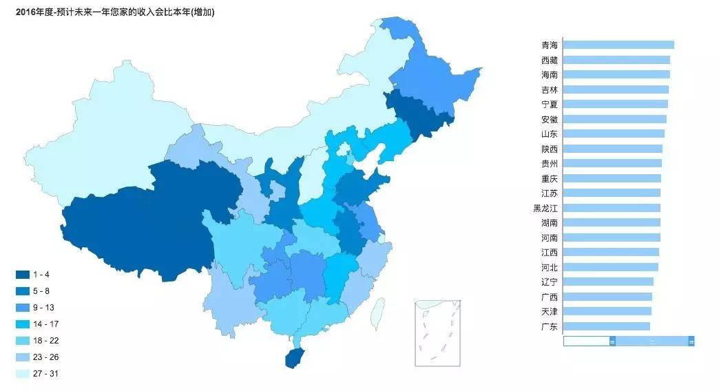 從省份看,收入信心排名前十的是青海(67.77%)、西藏(64.89%)、海南(64.86%)、吉林(64.34%)、寧夏(64.00%)、安徽(62.79%)、山東(61.79%)、陜西(60.38%)、貴州(59.80%)和重慶(59.41%)。