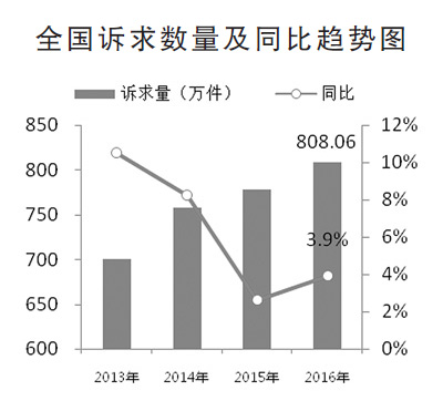 一、全國訴求總量超過800萬件,投訴量為歷史新高。2016年全國工商和市場監管部門受理消費者訴求超800萬件,同比增長3.9%,增速較上年同期提升1.3個百分點。其中,投訴166.70萬件,同比增長29.1%,增長速度明顯高于“十二五”時期。