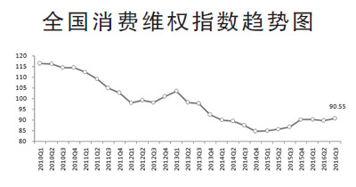 六、全國消費維權指數連續兩季度超過90,總體消費環境穩中向好。自2015年四季度以來,全國消費維權指數值連續四個季度維持在90左右(100是中值),2016年第三季度為90.55,較上期值上漲0.99個百分點,表明全國消費環境總體呈現穩中向好的態勢。