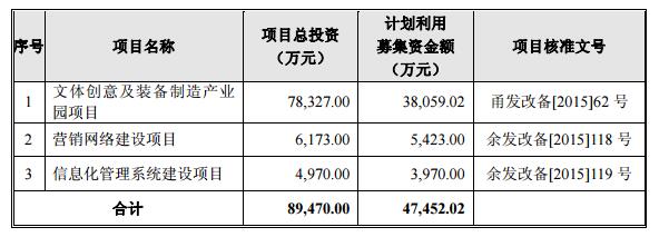 本次發行募集資金總額為53,974.60萬元,扣除發行費用後募集資金凈額為47,451.55萬元。募集資金投向為文體創意及裝備制造產業園項目、營銷網絡建設項目、信息化管理係統建設項目。計劃利用募集資金額分別為38,059.02萬元、5,423.00萬元、3,970.00萬元。