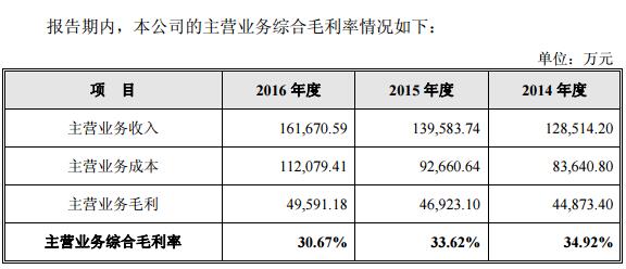 2014年度、2015年度及2016年度,大豐實業的主營業務毛利率分別為34.92%、33.62%和30.67%。報告期內,大豐實業主營業務毛利率基本保持穩定。2016年,主營業務毛利率下滑至30.67%,主要係營改增調整及公共裝飾業務佔比增長所致。