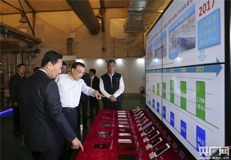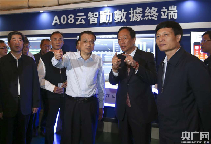 李克強9日考察鄭州富士康科技園,郭臺銘董事長親自介紹。在廠房前兩人駐足交談5分鐘,臨上車前再次駐足交流。總理說,希望富士康把更多高端研發和全產業鏈放在這里。我們會進一步擴大開放、優化營商環境。中國有巨大的市場和人才資源,是發展制造業的最佳投資目的地。
