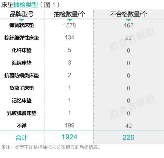 《消費者報道》梳理質監局與消委會的抽檢與測試信息顯示,1924條床墊的抽檢信息絕大部分是針對彈簧床墊的抽檢,高達82.0%,其次是棕纖維床墊,佔7.0%,這與產品市場份額也比較吻合,(如圖1)