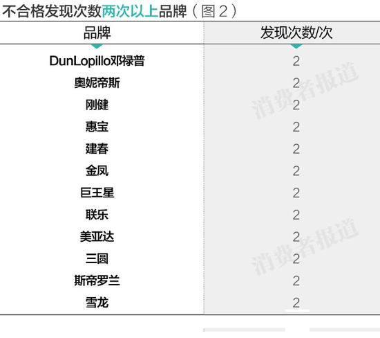 在不合格名單中,大部分品牌上榜次數為1。其中,在北京消委會在2013年4月發布的床墊測試中,宜家、愛舒等品牌均出現不達標現象。不合格次數達到2次的品牌如圖2。