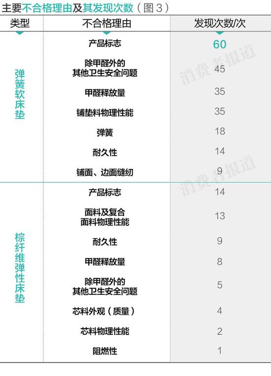 《消費者報道》對234條不合格信息分析發現,床墊的不合格理由較多,主要集中在產品標志、甲醛等衛生問題方面。