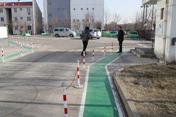 行人步道放在路側,寬度只有60公分,為了限制兩個人並排行走,必須一前一後,快速行進。廠區內要求步速是每秒1.5米。