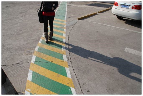 在停車區,行人步道會有穿越機動車的危險時,會使用黃色警告色告知行人。