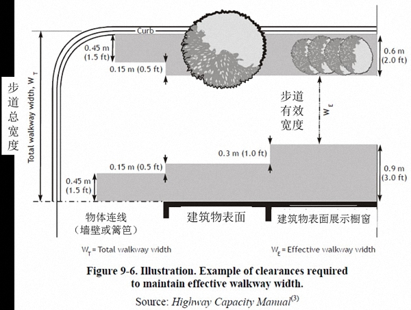 步行文化的培養離不開硬件問題,最基礎的就是人行道的有效寬度。下圖是美國交通部門給出的行人步道有效寬度的計算規則示意圖。
