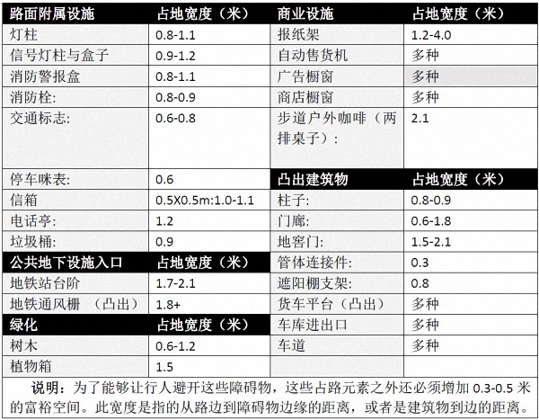在紐約市的行人步道有效寬度設計規范里,有更多詳細的指標要求,對各種佔路設施的寬度都進行了羅列,要求在計算有效步道寬度時,考慮這些步道寬度內的強制佔路元素,見下表:
