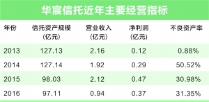 地處內蒙古的華宸信托,無論是營業收入還是凈利潤,抑或信托管理規模,在業內都排名都較靠後。2016年,該公司營業收入為9320萬元、凈利潤為3687萬元,均位居68家信托公司最後一位。
