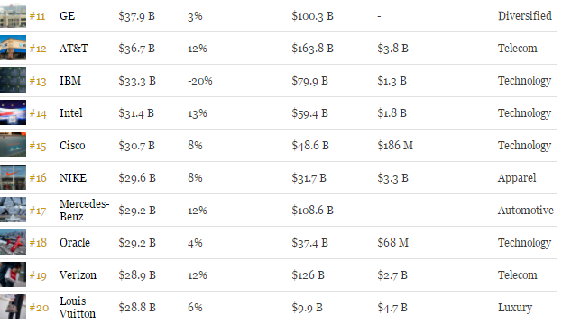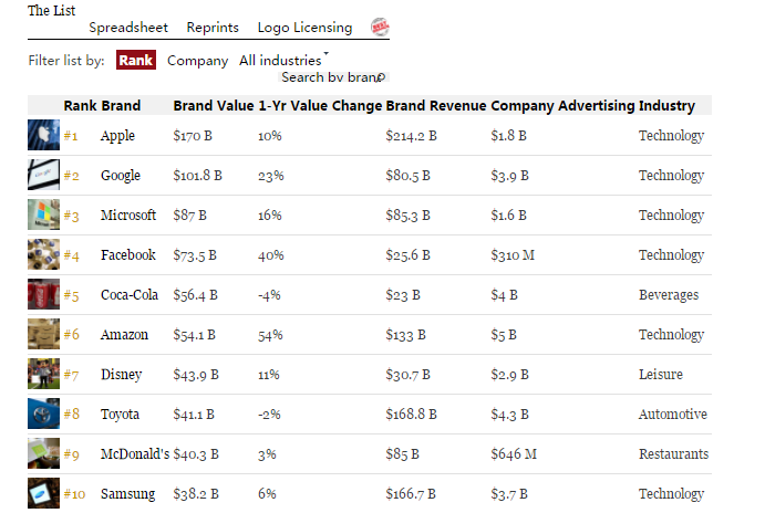 福布斯每年都會在全球考察超過200個國際品牌並篩選出100個最具價值品牌,此份榜單中的100大品牌來自15個國家,美國以56家公司入圍獨佔鰲頭、德國(11),法國(7)和日本(6)緊隨其後。科技企業以18家入圍成為最熱門行業,前十五名中有9家是科技公司,金融服務業有13家公司入圍,美國運通以245億美元領銜(第22位),快速消費品有12家公司入圍,吉列以192億美元位居行業第一(第28名)。