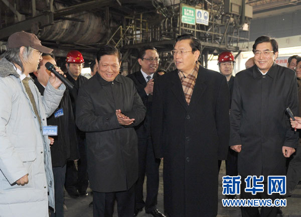 1月13日,中共中央政治局委員、國務院副總理張德江出席首鋼北京石景山鋼鐵主流程停產儀式並發表講話。這是張德江出席停產儀式後參觀已經停產的三高爐。新華社記者馬佔成 攝