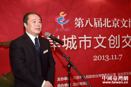 北京市臺辦副主任黃塞溪在第八屆北京文博會兩岸城市文創交流酒會上宣布,為進一步深化兩岸文創交流與合作,北京市相關文化單位推出三項新舉措。(中國臺灣網 王偉 攝)