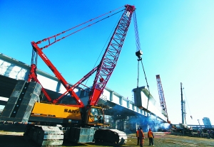 圖為京密高速聯絡線打通斷點的吊梁施工現場。 (本報記者 涂露芳攝)
