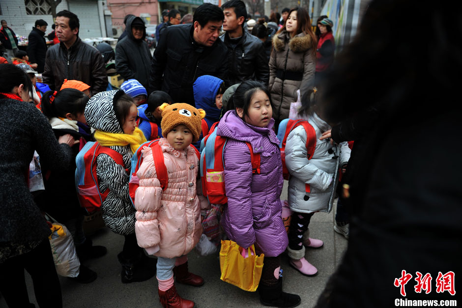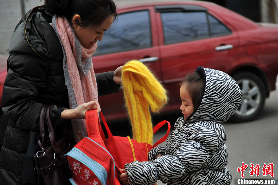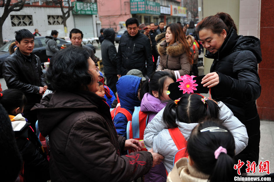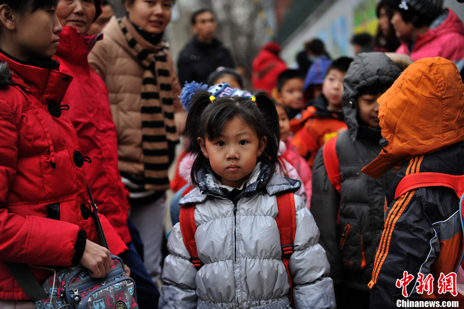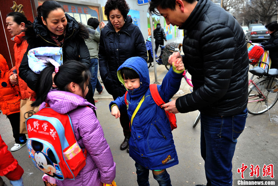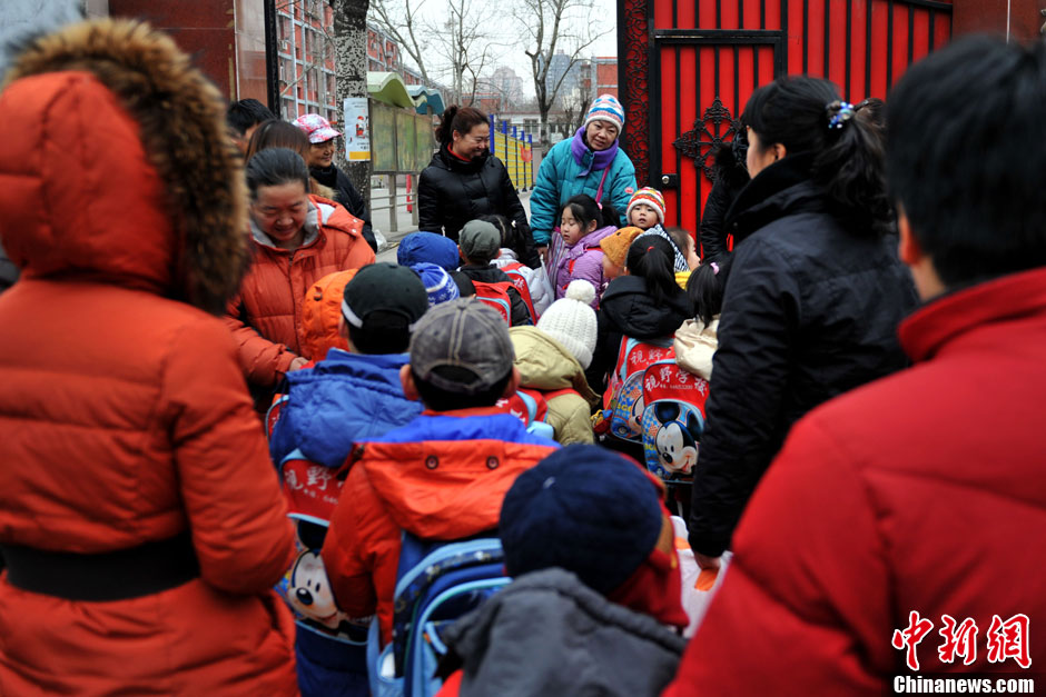 據交管部門預計,全市交通將迅速恢復到節前水平,特別是早晚高峰的交通壓力將明顯增大。根據往年交通指數分析,預計早8點至晚8點半之間全路網最為擁堵,將達到至少4.0以上“輕度擁堵”水平。圖為一位家長把孩子送到學校。中新網記者 金碩 攝