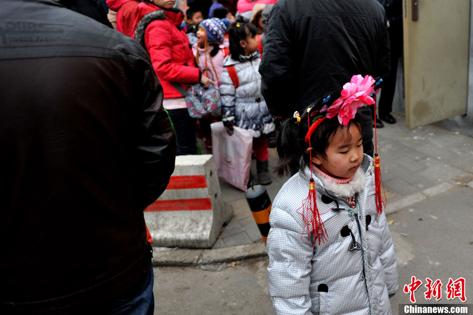 2月17日,北京市中小學新學期開學首日,勁松小學一名頭戴“格格”發飾的小女孩在姥姥的“護送”下來到學校報到,造型驚呆老師。中新網記者 金碩 攝