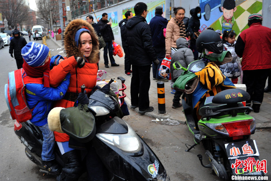 2月17日,北京市中小學開學,接送學生的車流迅速增加,北京交通逐漸告別“節日狀態”恢復到節前水平。因此不少送孩子的家長為了避免堵在路上,選擇騎自行車、電動車或步行送孩子到學校。圖為一位家長騎電動車將孩子送到學校。中新網記者 金碩 攝