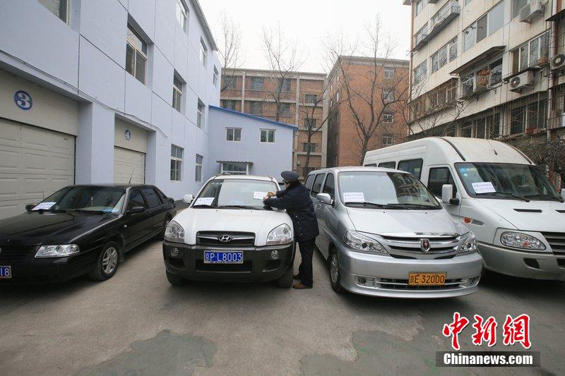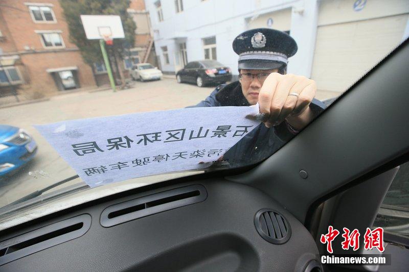 2014年2月24日上午,北京,工作人員給停駛的公車貼“封條”。付丁 攝 圖片來源:CFP視覺中國