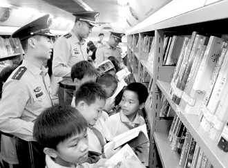 4月23日“世界圖書日”前夕,廣東中山公安邊防支隊聯合中山市圖書館開展“流動圖書車進校園”活動,將載有上千冊的流動圖書車開進校園供學校師生借閱,讓駐地師生享受各類課外書籍文化大餐。                   本報通訊員 李松林 梁華 攝