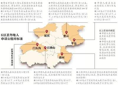 截至目前,北京共有6個區縣出臺了外地人申請公租房標準,分別是石景山、通州、平谷、門頭溝、延慶、密雲。