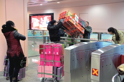 由于不能通過▲閘機,乘客將貨物“空投”進站。
