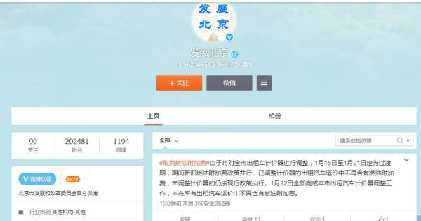 據北京市發展和改革委員會官方微博消息,由于將對北京全市出租車計價器進行調整,1月15日至1月21日定為過渡期,期間新舊燃油附加費政策並行,已調整計價器的出租汽車運價中不再含有燃油附加費,未調整計價器的仍按現行政策執行。1月22日全部完成北京市出租汽車計價器調整工作,北京所有出租汽車運價中不再含有燃油附加費。
