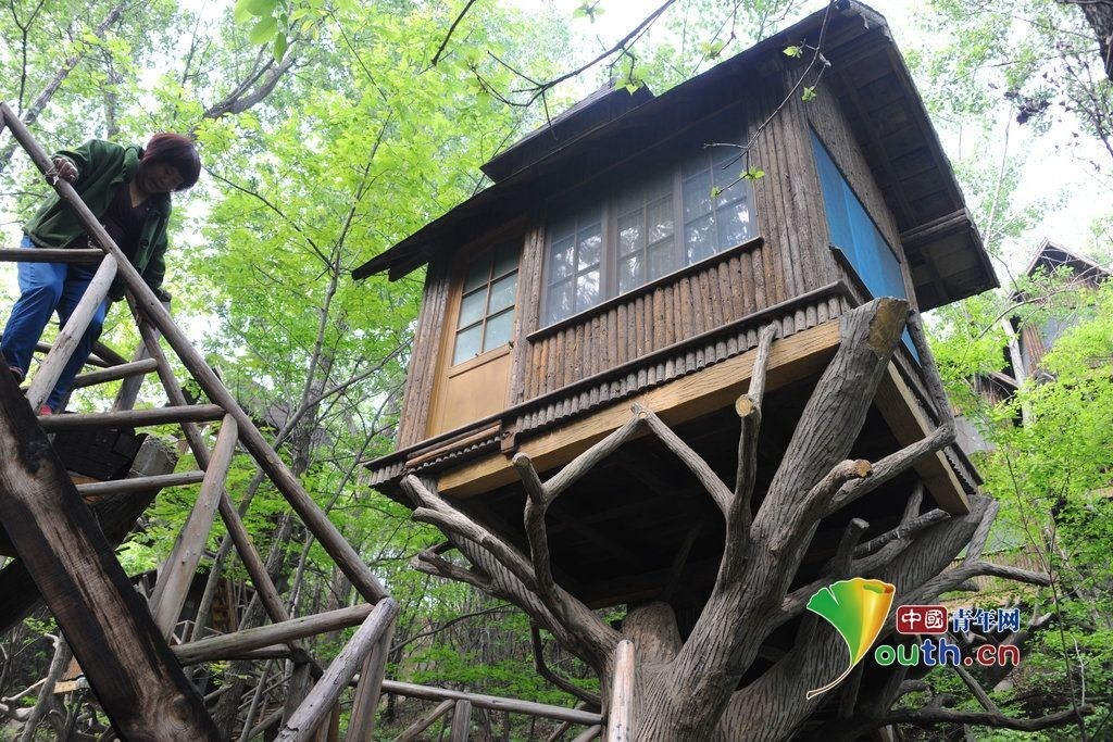 山東省濟南市,在濟南一景區內,綠樹充盈的山溝里在樹上建造的空中“旅館”如同童夢幻一般,吸引遊客的目光。現場,走進樹屋里面有雙人床、廁所、電視機、窗臺、凳子等家具,如同一個“微型”小旅館。