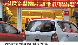 昨日,記者在廣州天河北商圈看到一家銀行在外部招牌顯示屏上公然宣傳稱首次開金卡,且資產在5萬元以上的客戶可以獲贈中糧特色大米一袋。“事實上,年底攬存一般都是通過私下告知客戶的方式進行,而該行當街打出這樣的廣告,可見其攬客的心情還是很迫切的。”銀行業內人士李先生告訴記者。