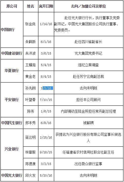 從2015年年初開始,先有平安銀行前副行長陳偉辭職,出任陸金所常務副總;再有興業銀行時任副行長陳德康出任微眾銀行監事;後有華夏銀行前副行長黃金老跳槽加盟蘇寧,分管蘇寧雲商以及互聯網金融事務。