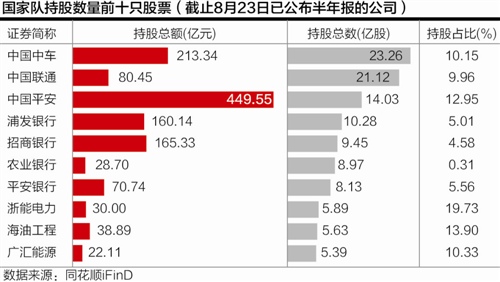 最新的數據顯示,“國家隊”目前持股數量最多的公司為去年剛剛完成合並的 中國中車 ,持倉數量為23.2億股,涉及金額為213.3億元。其次是中國聯通,持股數量為21.1億股。 中國平安 排在第三位,“國家隊”目前持股14億股,雖然持有的數量不算最多,但是佔用的資金卻是最大,涉及金額高達449.5億元,超過第一名中國中車的2倍。目前“國家隊”持股比例佔中國平安流通盤的12.95%:其中證金公司持有7.4億股,匯金持有4.8億股,國家隊的兩只基金——博時中證金融資產管理計劃和招商豐慶靈活配置基金各持有1.7億股和1051.3萬股。