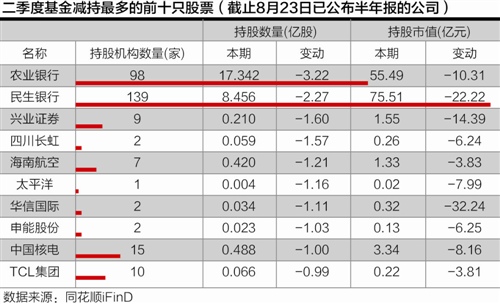 與“國家隊”的策略相反,公募基金在上半年大肆減持了金融股。同花順的數據顯示,上半年公募基金減持的前二十名公司中,有八只都是金融股。有46只基金減持了農業銀行,減持數量達到3.2億股。排在第二、三位的是 民生銀行 和 興業證券 ,分別有100只基金和2只基金減持,減持股數是2.27億股和1.6億股。