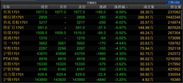 11月15日下午收盤時,黑色係商品期貨全線遭遇洗倉,焦炭期貨主力合約午後跳水暴跌,以8.56%的跌幅位居第一。螺紋鋼、熱軋卷板、鐵礦石全部封住跌停板,焦煤重挫5.92%。