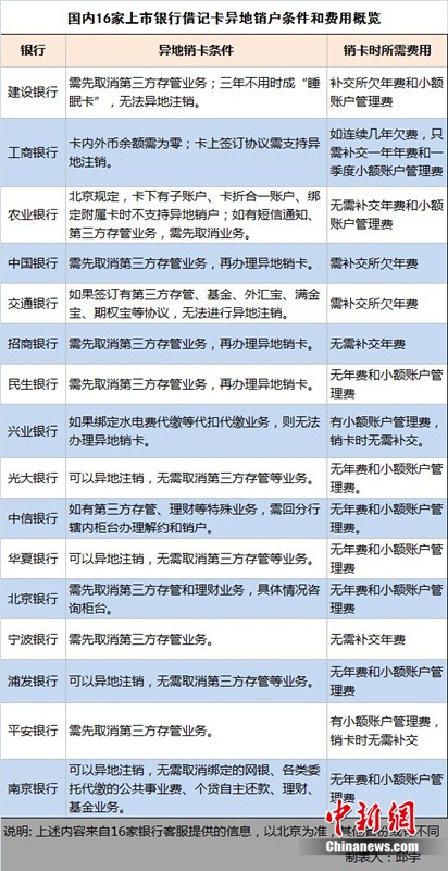 國內16家上市銀行借記卡異地注銷條件和費用概覽。