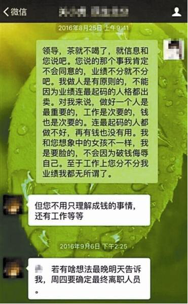 其一,業績為王,除了業績其他表現都沒用。據曝光的微信聊天記錄顯示,關某某多次提及“業績”問題。並稱“見面聊聊不會讓你這麼為難吧!”