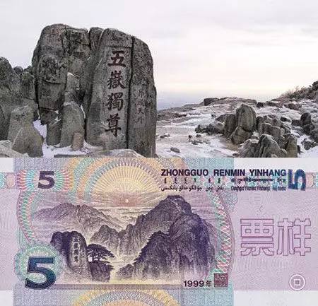 第五套人民幣10元的背面圖案是泰山,不過這個圖案採用了空間“蒙太奇”的手法,把“五岳獨尊”的石刻和泰山主峰兩個場景放到一起,在現實中是看不到這樣的景觀的。