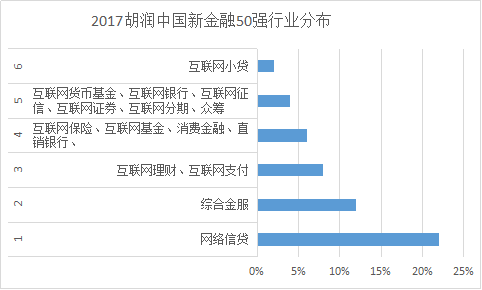 從行業分布來看,2017胡潤中國新金融50強涵蓋了新金融領域15大細分領域。其中網絡借貸行業佔22%,以11家上榜企業繼續領跑50強,但上榜企業數量相比去年減少4家,這與網絡借貸行業目前正經歷的嚴格監管密切相關;綜合金服佔12%,上榜企業有6家,位居次席;互聯網理財和互聯網支付上榜企業都有4家,共同佔據第三名的位置;另外,互聯網保險、互聯網基金、消費金融和直銷銀行都有3家企業上榜;互聯網貨幣基金、互聯網銀行、互聯網徵信、互聯網證券、互聯網分期和眾籌6大領域都有2家企業上榜,互聯網小貸有1家企業上榜。胡潤表示:“雖然今年網絡借貸企業數量減少4家,但仍在新金融行業佔主導地位。”