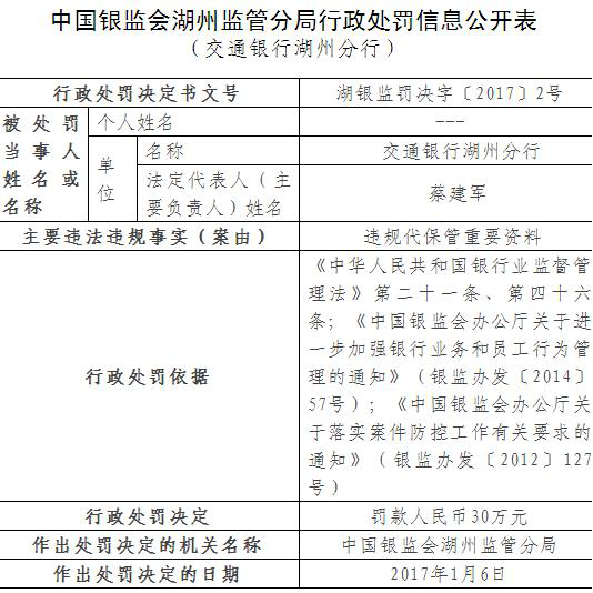 今年1月20日,銀監會網站公布消息,交通銀行湖州分行因違規代保管重要資料,被中國銀監會湖州監管分局罰款人民幣30萬元。